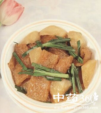 功能:活血滋阴,润燥泽肤。本膳用猪皮,性平,味甘、咸,能润燥泽肤,活血滋阴,所含蛋白质主要是白蛋白、球蛋白、角蛋白、弹性蛋白、胶原蛋白等;莴笋,含多种维生素,能清热润肤;黑木耳,滋阴补肾;玉兰片以增香添色。
