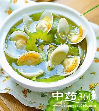 功能:清热和胃,增白养颜。本膳用苦瓜,清热和胃,清心解毒;文蛤,含蛋白质、多种人体必需氨基酸、维生素E、维生素A、维生素B2、钙、磷、铁、硒等成分,能增白美容。