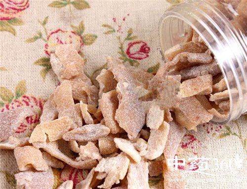 1、原料处理:干陈皮要经脱苦,把干陈皮用多量水浸泡变软,通过几次换水脱去苦味为止。